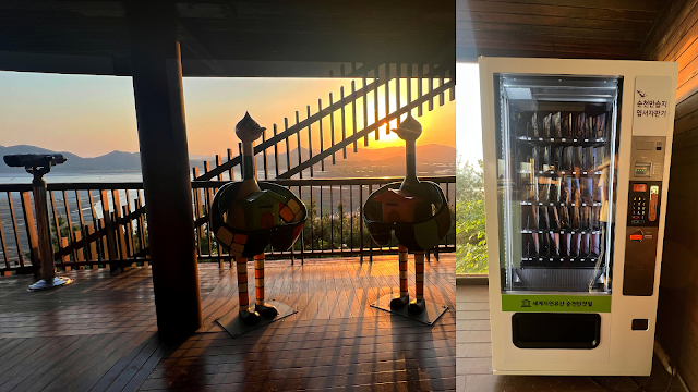 請原諒卡卡的拍照技術不合格,卡卡沒能將現場看見的壯觀畫面以照片方式呈現給大家,但現場真的是滿滿感動,看著茜色宛如高級有機蛋黃的太陽,緩緩地落入遠方的山,直到暮色緩緩變紫、變青、變暗。這時的卡卡沒有近黃昏的落寞感,反而覺得很幸福,慶幸自己有來韓國順天市,慶幸自己就算穿著7公分的高跟靴子也要走上龍山,因為一切都太值得了啦!